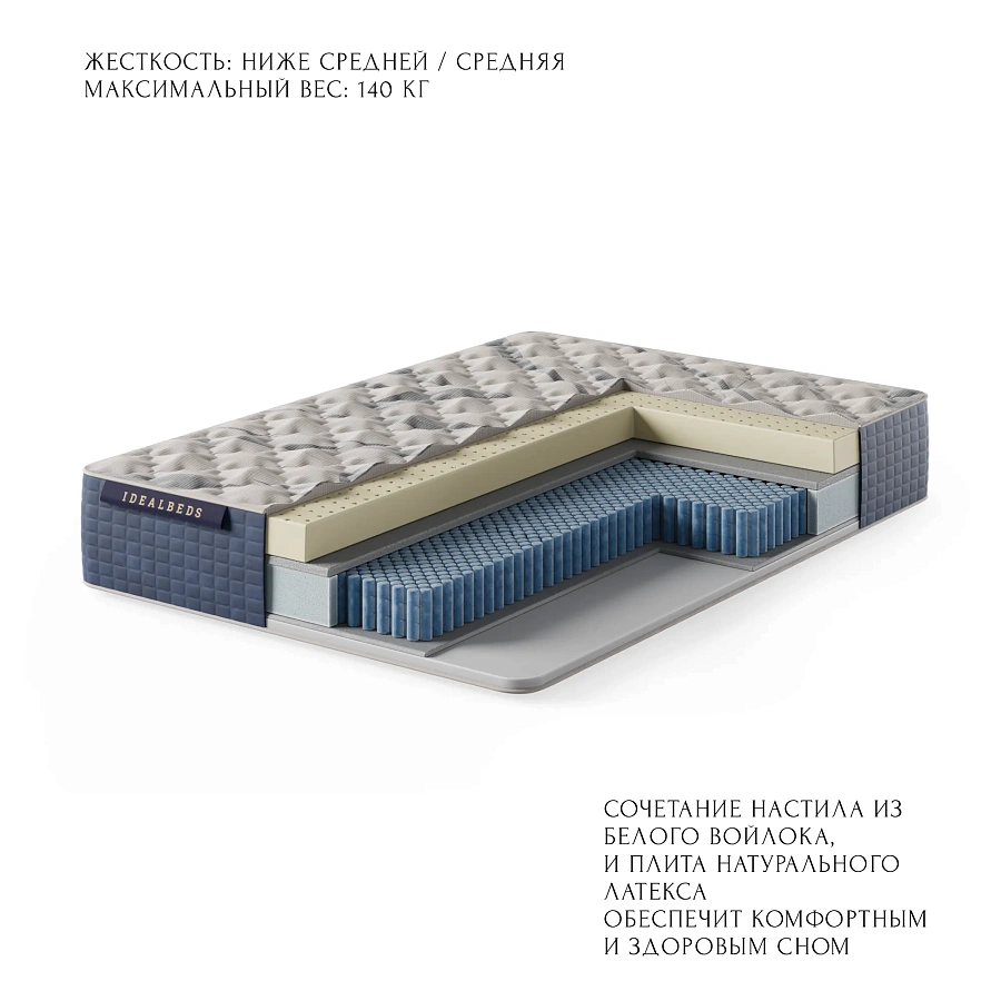 натуральный латекс 5 см / настил белого войлока / блок независимых пружин мультипокет / настил белого войлока / настил холкона 700 гр 2 см